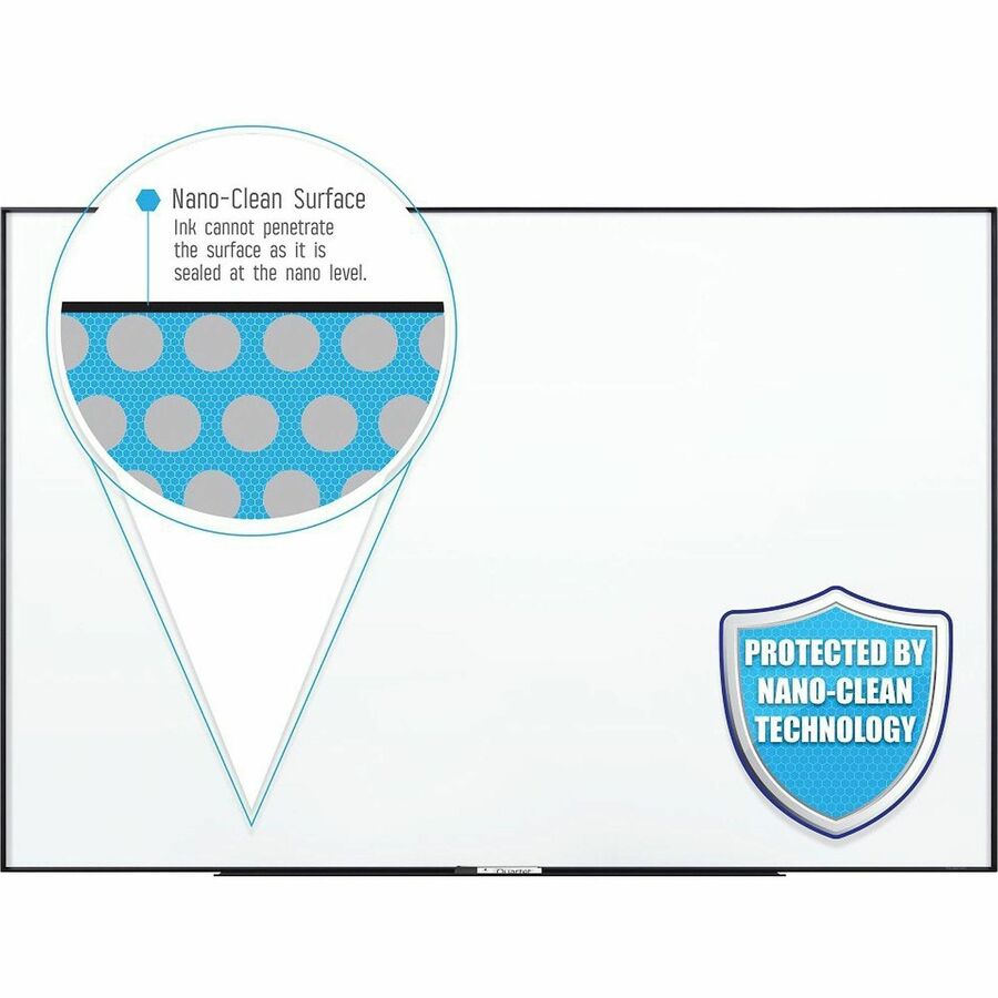 Innovative whiteboard surface uses nanotechnology to prevent ink from penetrating the surface. A hydrophobic, Nano-Clean surface coating delivers exceptional ghost-resistance and stain-resistance with superior erasability so you enjoy top-notch performance in extremely heavy-use environments. Nanoparticles fill voids on the board surface to prevent ink from staining or ghosting. Whiteboard surface is magnetic to offer equal functionality for smooth writing and posting of printed materials. Board surface is recessed from the black aluminum frame for a fresh, clean look. The whiteboard can be mounted vertically or horizontally with included Z-bracket mounting hardware. The board also includes a marker tray and one Quartet dry-erase marker.